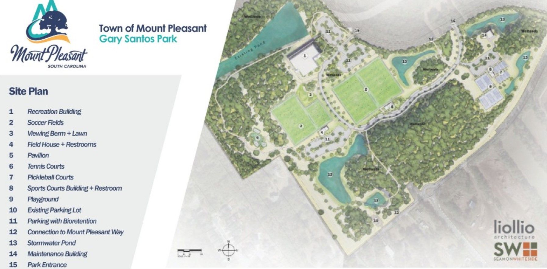 The Park will include a two court gymnasium with program rooms dedicated to music, art, dance, and camp activities, along with three and a half lighted rectangular athletic fields, tennis courts, pickleball courts, picnic pavilions, a playground, and newly installed trails.